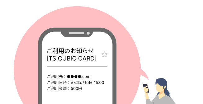 カードのご利用都度、リアルタイムでご利用内容(利用金額や利用店など)をメールでご確認いただけるサービスです。