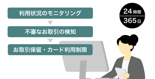 不正検知システムにより不正利用の傾向と合致していると判定された場合は、お取引の保留・カードのご利用制限を行ったうえで、お客さまへ利用確認のご連絡をしております。