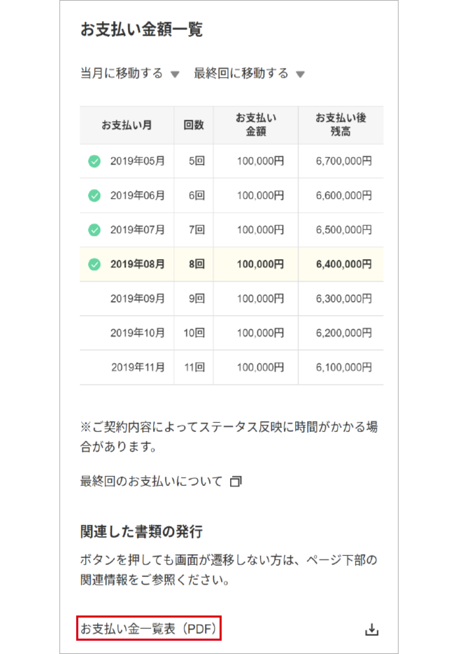 MY TS CUBICにて初回から最終回までの支払日・金額・残高をご確認いただけます。また、画像の赤枠部分より「お支払金一覧表」をPDFでダウンロードすることができます。