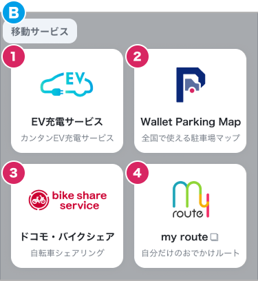 EV充電サービス、ドコモ・バイクシェア、Parking Map、my route