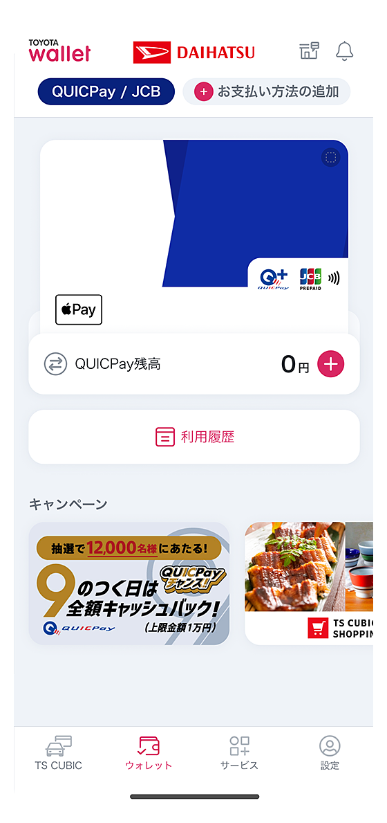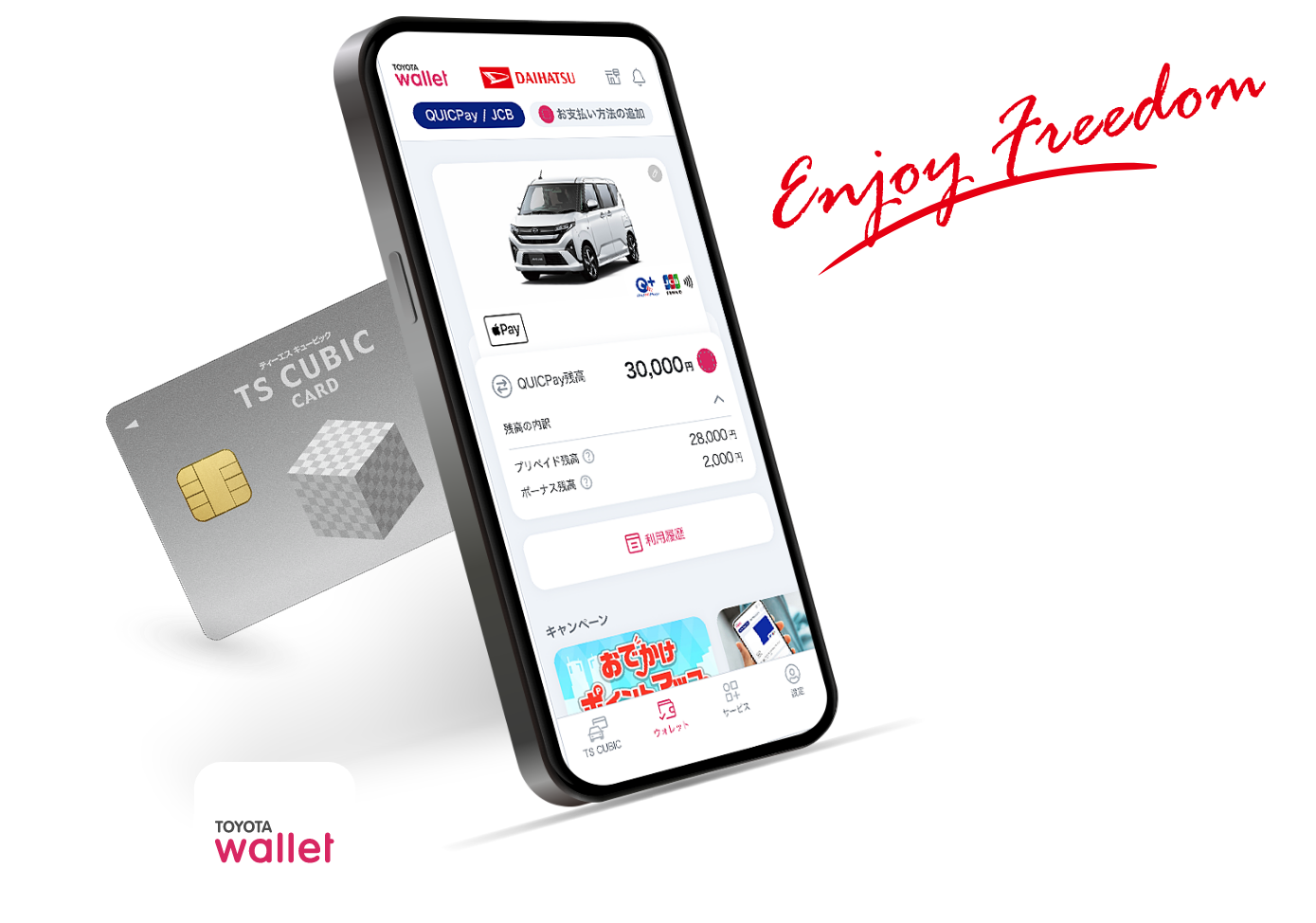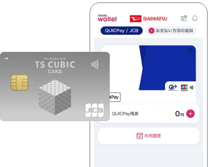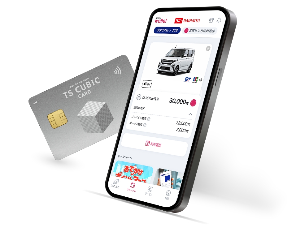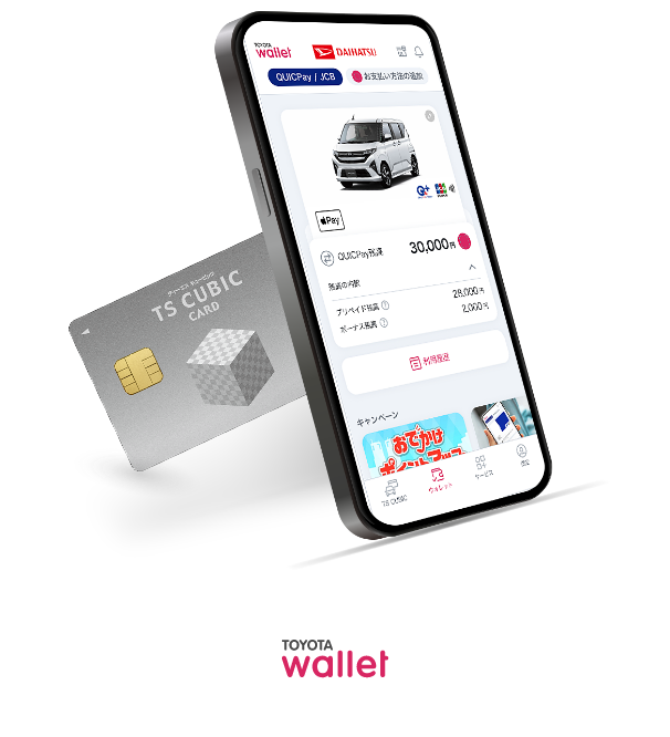 いつものお支払いを、TOYOTA Walletに「DAIHATSU TS CUBIC CARD」を設定したスマートフォン決済で。