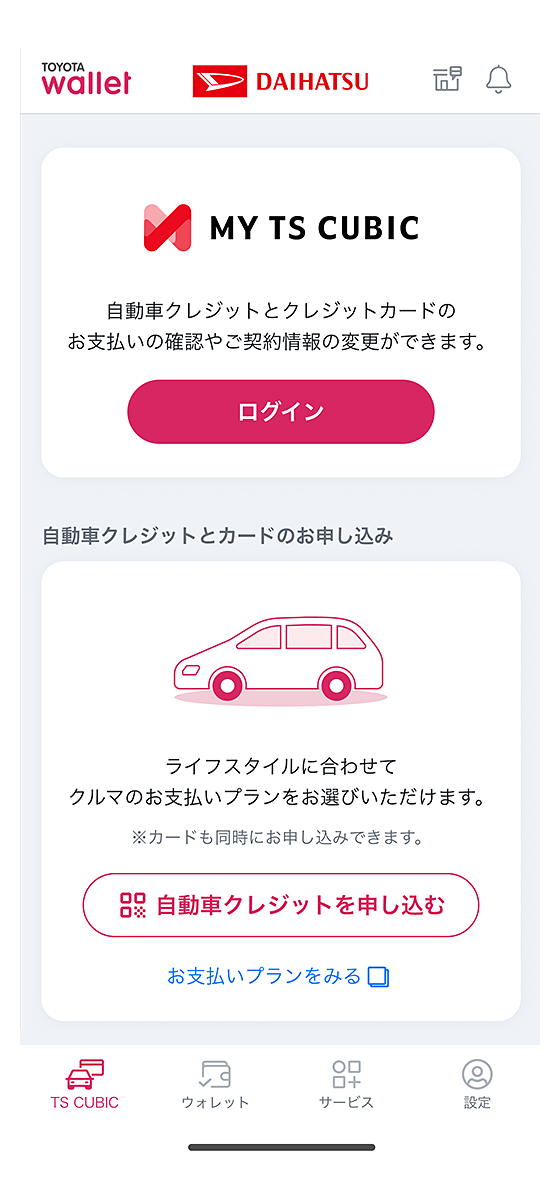 - TOYOTA WalletでのダイハツクレジットやDAIHATSU TS CUBIC CARDの申し込み方法を知りたい。