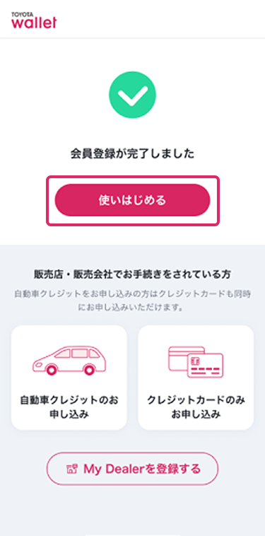 「使いはじめる」ボタンをタップしてTOYOTA Walletをご利用ください。