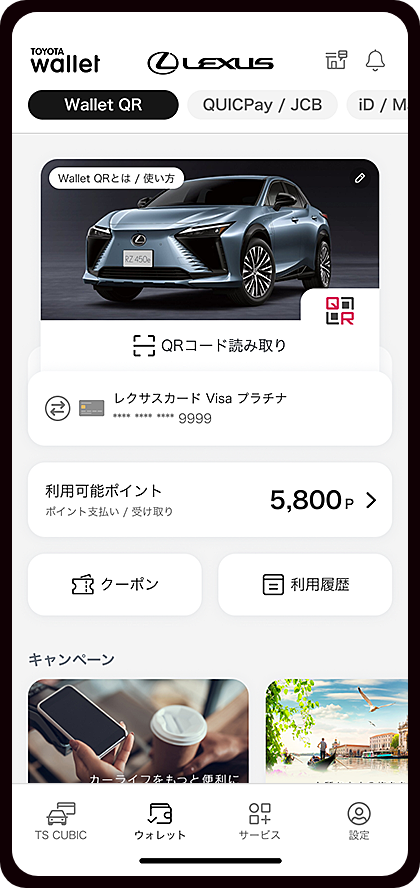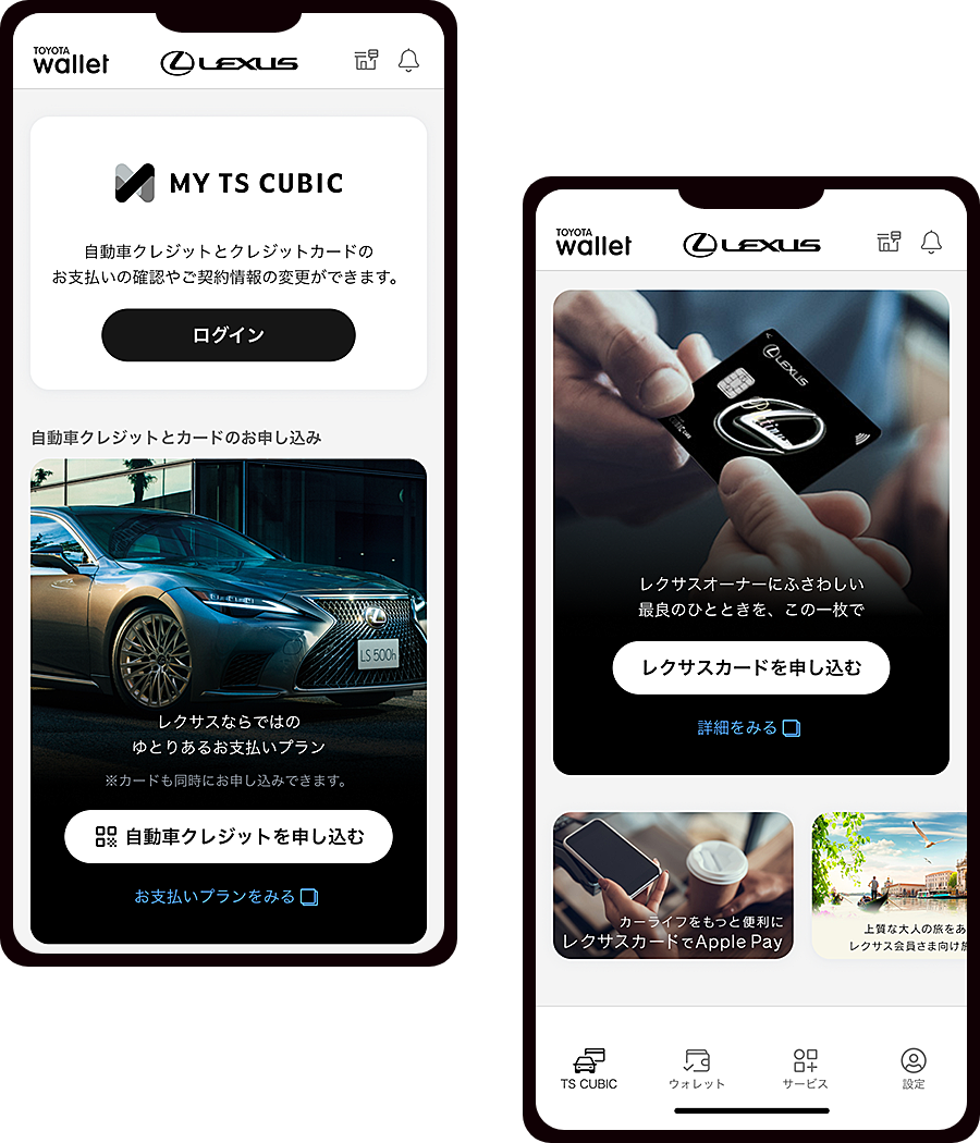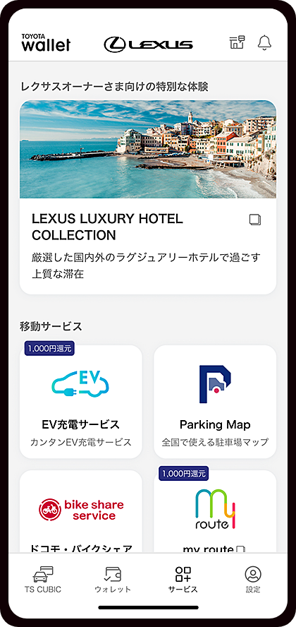 - 既にレクサスをご購入のお客さま、TOYOTA Walletアプリからのお申し込みではないお客さまは「設定」からレクサスカードのご登録後にお試しください。